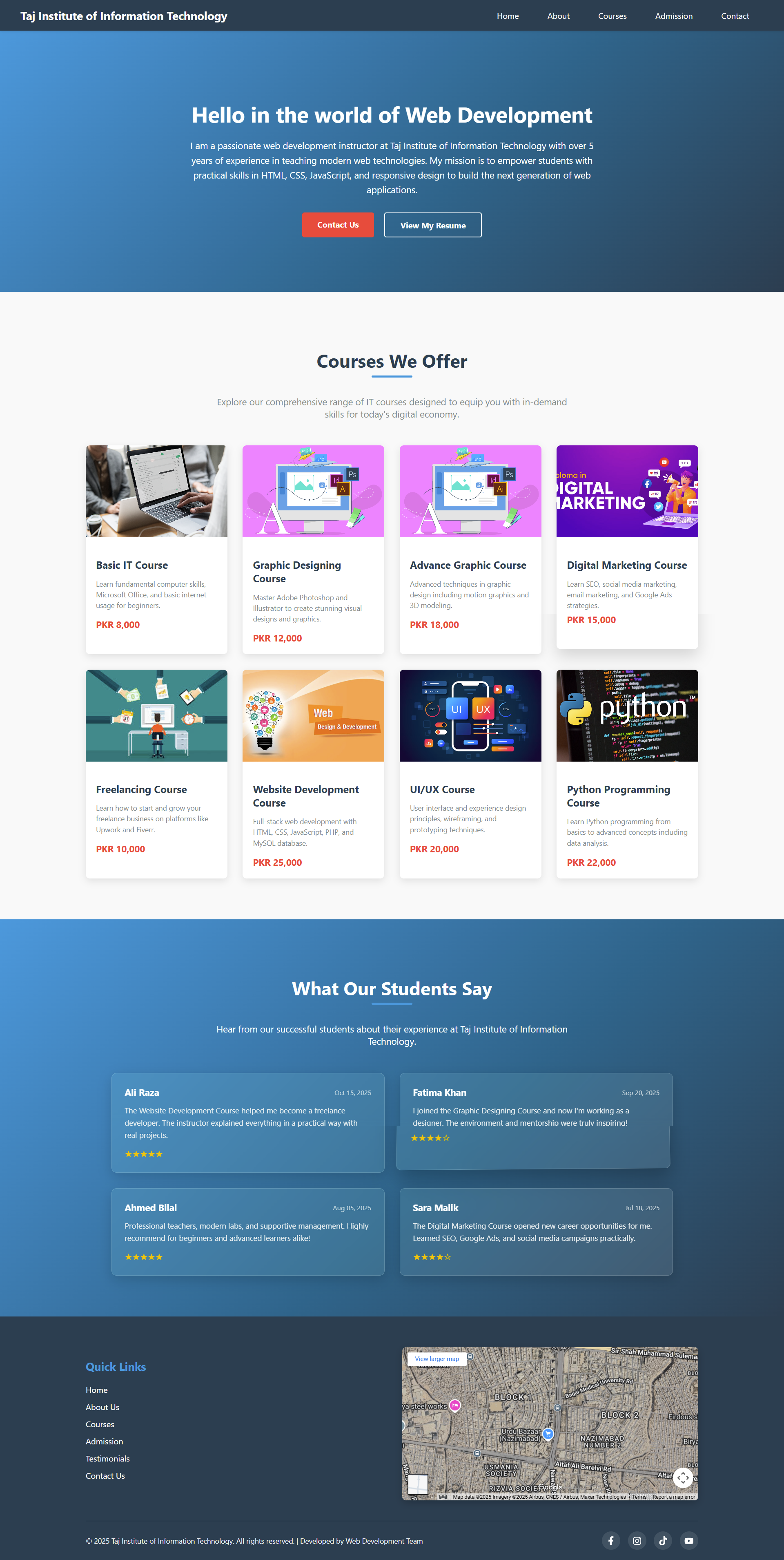 Trained as a Full Stack Web Developer at Taj Institute of Information Technology, gaining hands-on experience in building responsive websites and web applications using modern frontend and backend technologies.
